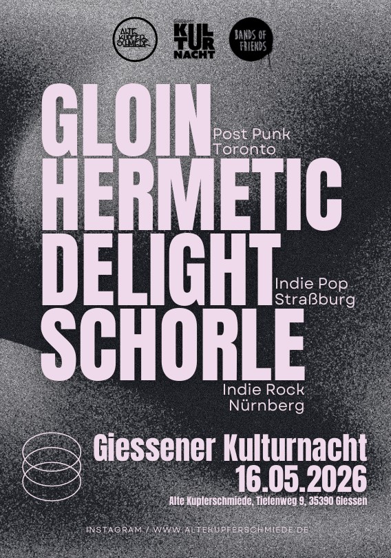 Die Gießener Kulturnacht kehrt in die Schmiede zurück. Das Konzert findet in Zusammenarbeit mit Bands of Friends statt.